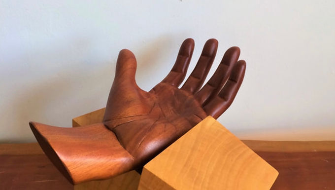 Selected and displayed at Wharton Esherick Museum themed competition. This piece featured the anticipation of an awaiting hand as a sphere is about to drop. The sphere acts as a locking mechanism when the cutting board is in use