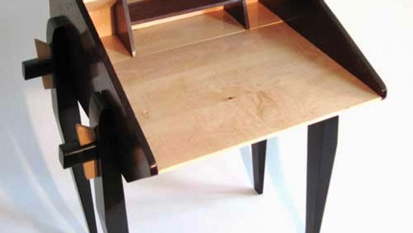 This desk features a Bubinga top that slides inside the desk to reveal maple interior. It also has a trestle style frame where wedges can be removed to disassemble.