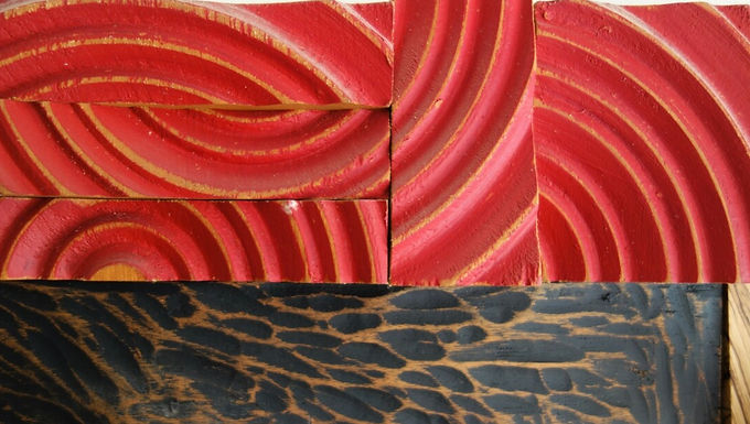 At the time I only had a lathe for wood turning, a band saw and simple hand tools for carving. I turned a square piece of mahogany on the lathe with 8 rings around the center to represent power, balance and a new beginning. I then cut it up into pieces and rearranged them to create the red sections of the work.